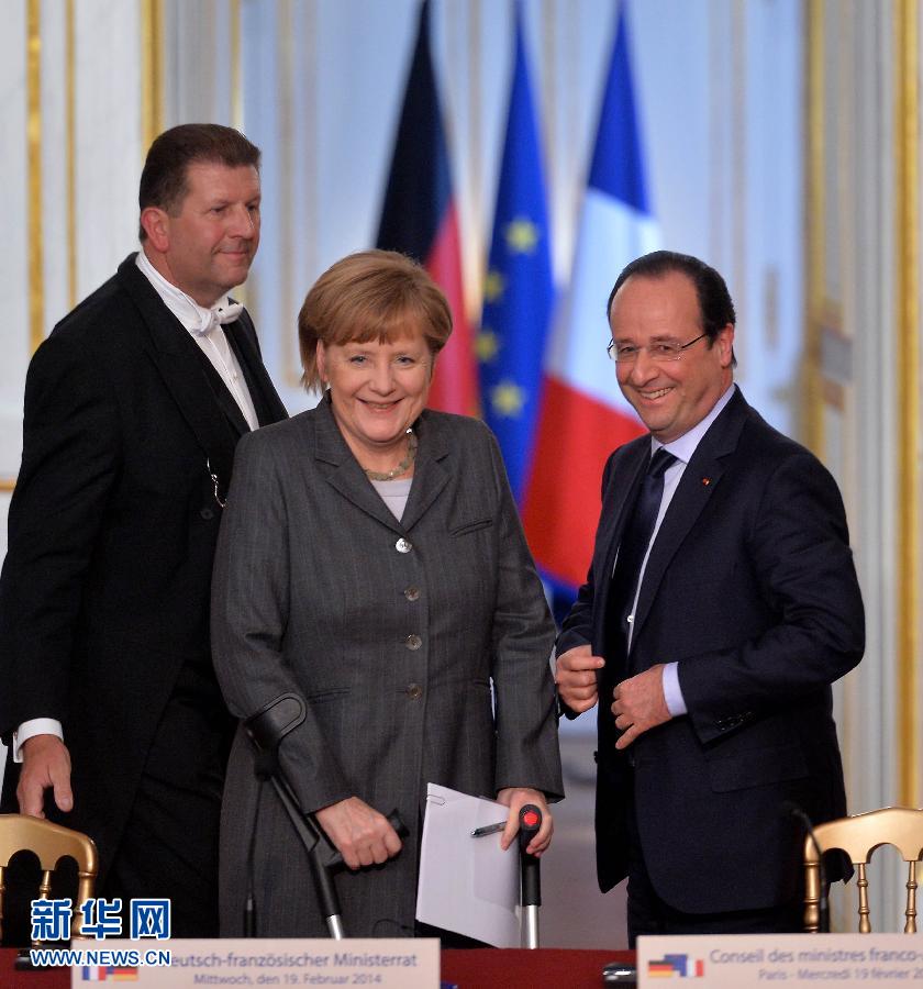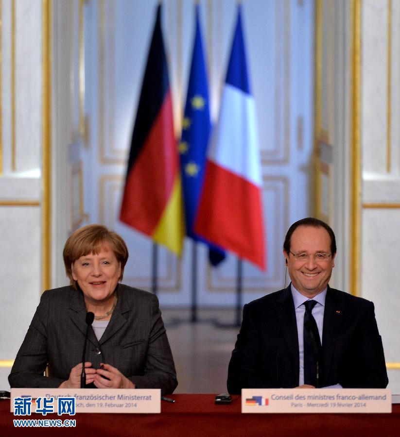 2月19日,法国总统奥朗德(右)和德国总理默克尔在法国巴黎参加法德联合内阁会议后会见媒体。当日,法国总统奥朗德与德国总理默克尔在法国总统府爱丽舍宫共同主持第16次法德联合内阁会议。会议决定在防务、清洁能源、欧洲建设等领域加强合作。新华社记者陈晓伟摄