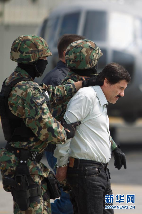 ( 2月22日,在墨西哥城海军军用机场,被士兵羁押的古斯曼(中)出现在新闻发布会上。墨西哥头号毒贩华金·古斯曼(绰号:“矮子”古斯曼)21日在军方的一次行动中,在墨西北部海滨城市马萨特兰被捕。 新华社记者张加扬摄 )