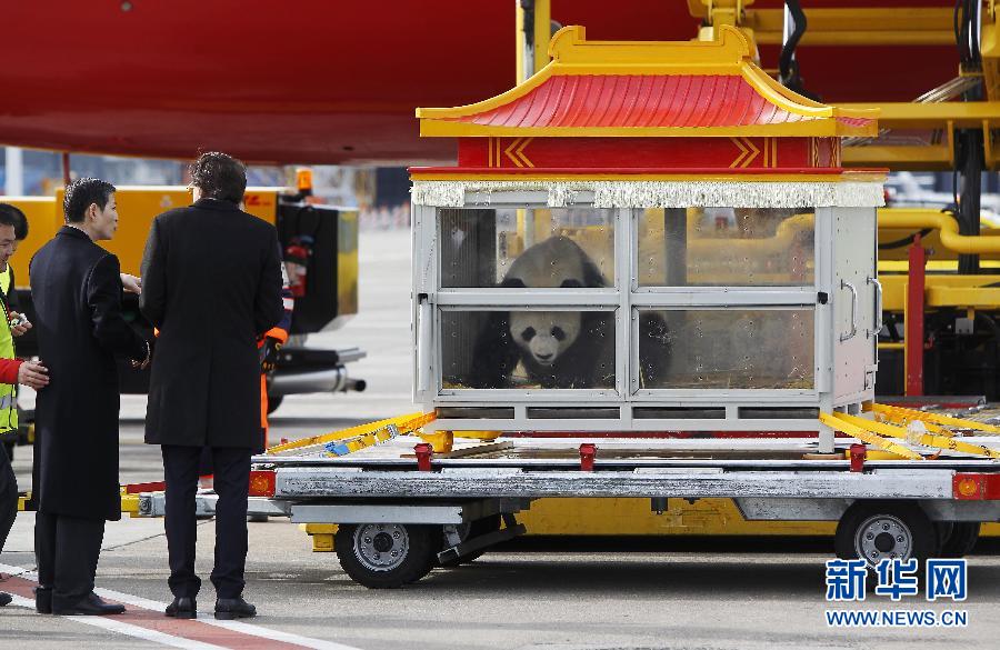 2月23日,大熊猫“好好”抵达比利时首都布鲁塞尔的国家机场。当日,大熊猫“星徽”和“好好”由货运专机运抵布鲁塞尔,将落户于距离布鲁塞尔市中心约60公里的天堂动物园。在比利时根特大学支持下,动物园已经为这对大熊猫设立了专门的繁育研究项目。“好好”和“星徽”将在天堂动物园旅居15年。新华社记者周磊摄