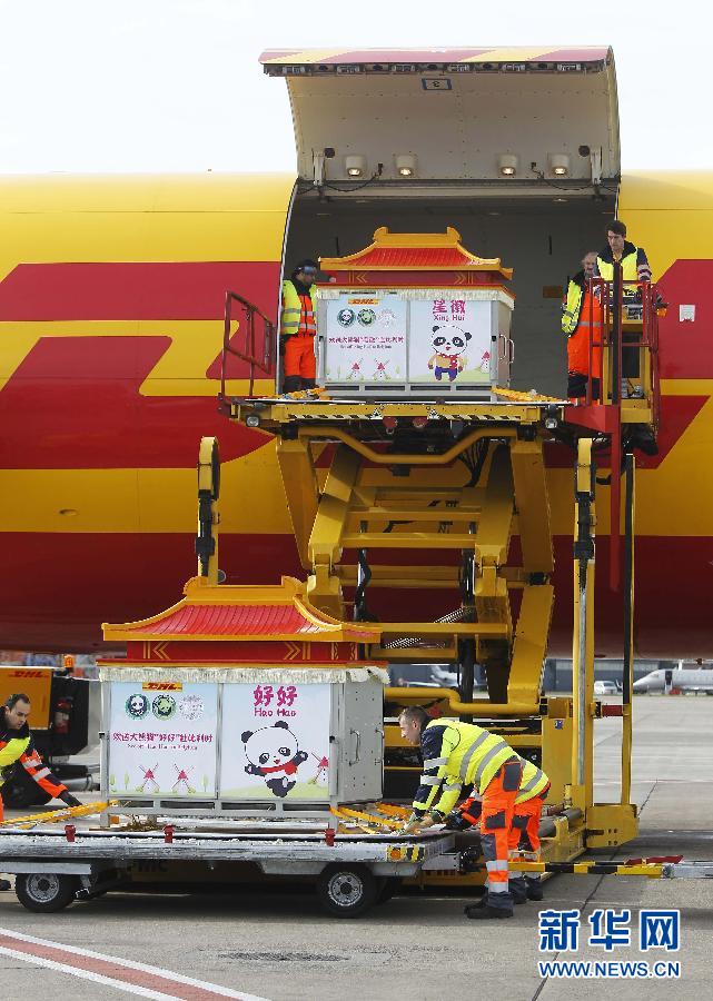 2月23日,大熊猫“星徽”和“好好”抵达比利时首都布鲁塞尔的国家机场。当日,大熊猫“星徽”和“好好”由货运专机运抵布鲁塞尔,将落户于距离布鲁塞尔市中心约60公里的天堂动物园。在比利时根特大学支持下,动物园已经为这对大熊猫设立了专门的繁育研究项目。“好好”和“星徽”将在天堂动物园旅居15年。新华社记者周磊摄