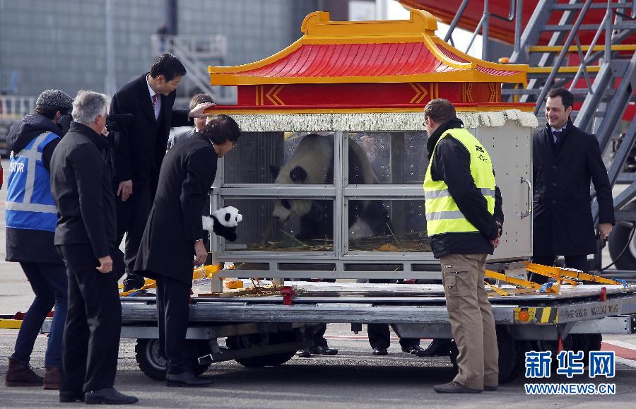 2月23日,大熊猫“星徽”抵达比利时首都布鲁塞尔的国家机场。当日,大熊猫“星徽”和“好好”由货运专机运抵布鲁塞尔,将落户于距离布鲁塞尔市中心约60公里的天堂动物园。在比利时根特大学支持下,动物园已经为这对大熊猫设立了专门的繁育研究项目。“好好”和“星徽”将在天堂动物园旅居15年。新华社记者周磊摄