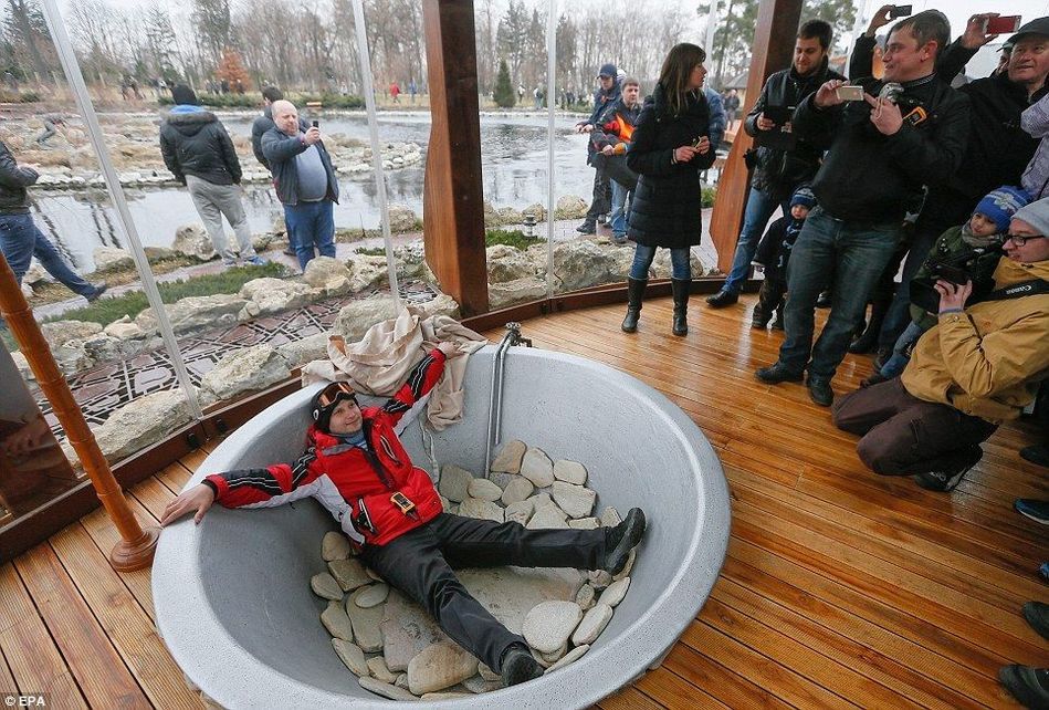 一名参观者“体验”别墅内的豪华浴缸。