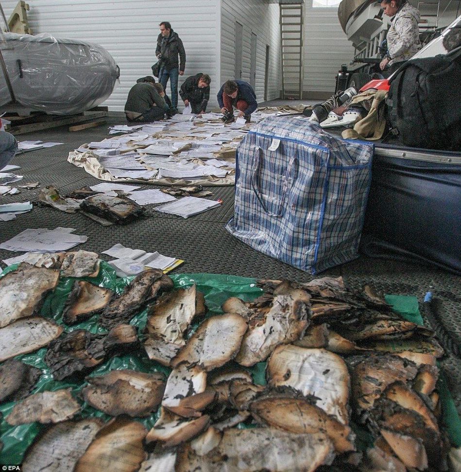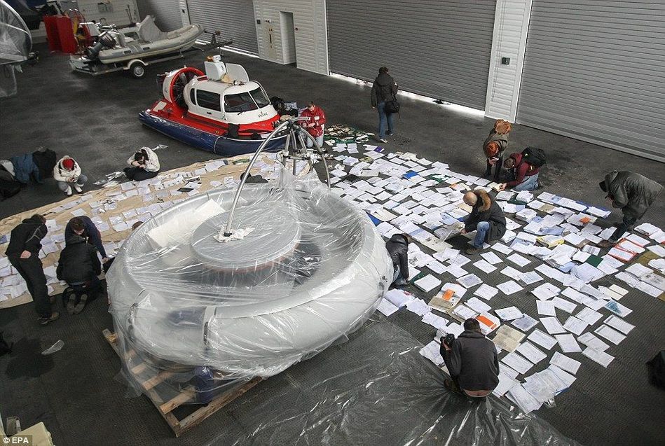工作人员整理遗留在别墅内的文件,他们身后是气垫船和喷气推进船。