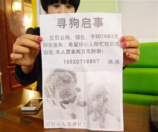昨日下午,记者见到了马小姐的这份“寻狗启事”,上面赫然写着“希望好心人帮忙找到或归还,本人愿拿两万元酬谢”的字样。“2万元不是一个小数目,如果帮上忙,一定兑现承诺!”马小姐说。