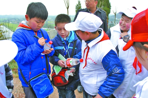 小记者陈柏羽(左一)在崇龛景区里花钱买了两瓶矿泉水,准备奖励给捡拾垃圾的游客。重庆晨报记者 吴国富 摄