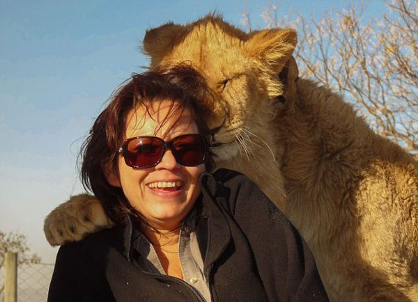 Jek的丈夫Chris现年50岁,是南非一名野生动植物摄影师。他称;“在南非的很多公园,游客都可以和野生动物近距离接触,包括大象、猎豹、猴子和狮子幼崽。但是狮子主动上前表示亲热还是非常罕见。”