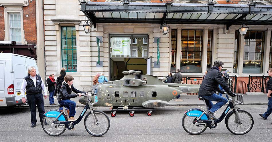 伦敦电影博物馆外展出的灰背隼直升机复制模型。它曾出现在第23部邦德电影《007:大破天幕危机》中。