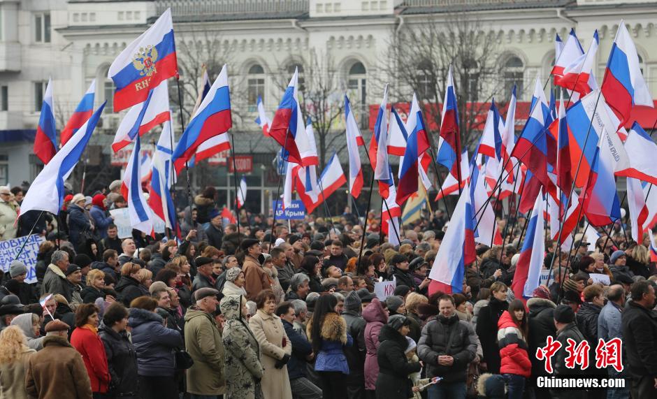 当地时间3月9日,支持克里米亚加入俄罗斯的民众手举俄罗斯国旗游行。继8日集会后,当日支持克里米亚加入俄罗斯的民众再度举行大规模集会。中新社发 王修君 摄