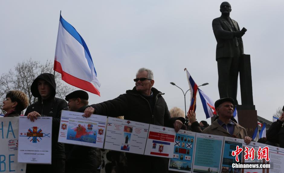 当地时间3月9日,支持克里米亚加入俄罗斯的民众在克里米亚政府大楼前面广场举行集会。继8日集会后,当日支持克里米亚加入俄罗斯的民众再度举行大规模集会。中新社发 王修君 摄