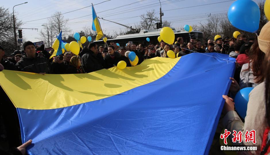 当地时间3月9日,支持乌克兰现政权民众手举大幅乌克兰国旗。继8日集会后,当日支持乌克兰现政权民众再次在辛菲罗波尔市举行集会。中新社发 王修君 摄