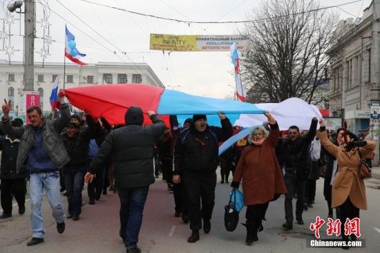 资料图:当地时间3月9日,支持克里米亚加入俄罗斯的民众手举俄罗斯国旗游行。继8日集会后,当日支持克里米亚加入俄罗斯的民众再度举行大规模集会。中新社发 王修君 摄