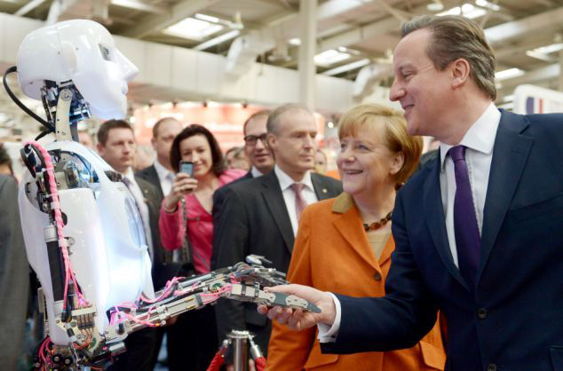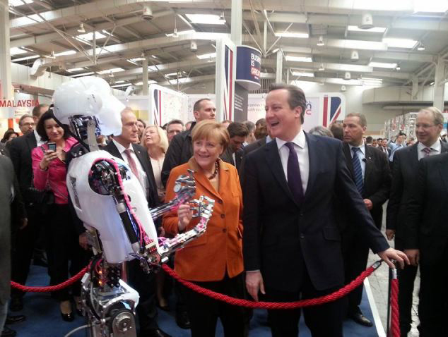 英国机器人在德展览会与卡梅伦握手