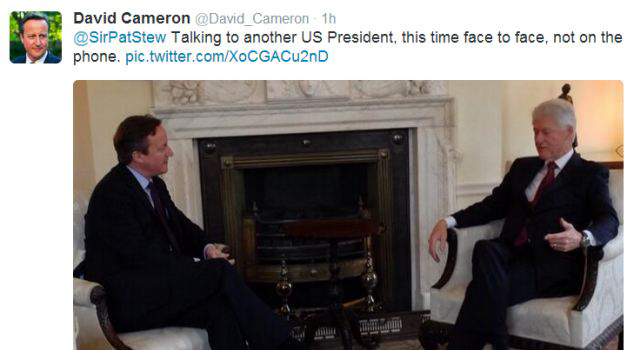 卡梅伦在Twitter上传自己会见美国前总统克林顿的照片。