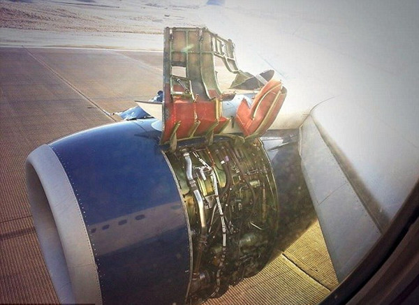 这架波音737客机上乘客拍摄到的照片显示,飞机的引擎罩已经裂开,内部引擎运转情况暴露出来。当时飞机已经起飞1个小时,注意到引擎传来异常震动后,机组人员决定紧急返回明尼阿波利斯的圣保罗国际机场。