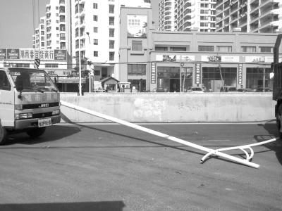 昨日10时许,记者赶至事发现场看到,该路段近10多辆过往车辆被堵,多名市民在场围观,交警执法人员正在现场进行盘问调查,市政工作人员则在用吊车拆除灯杆。记者注意到,该灯杆约8米长,被拦腰刮断横跨在路面上,旁边停有一辆挂车及一辆前车灯损坏的电动车。挂车司机称,他并没有刮倒灯杆,“我晚上12点就看到灯杆倒在那边,交警以为是我刮倒的。”