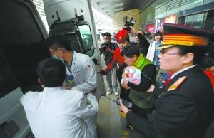 ③14时20分,家长怀抱着患儿迅速出站,登上救护车赶往北京儿童医院。