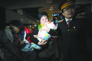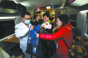 ①昨天,14时14分,北京南站工作人员和999急救医护人员登上刚刚进站的列车,对患儿进行初步的护理和检查。