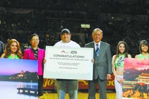 马刺队主场北京旅游日颁奖现场,中间举牌男子为中奖球迷戈麦斯。