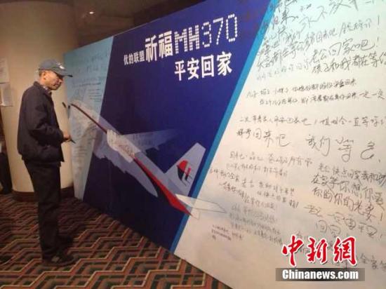 3月20日,北京丽都饭店家属区的马航失联航班祈福墙,众多乘客亲友在墙上留言祈祷家人朋友平安归来。中新社发 崔楠 摄