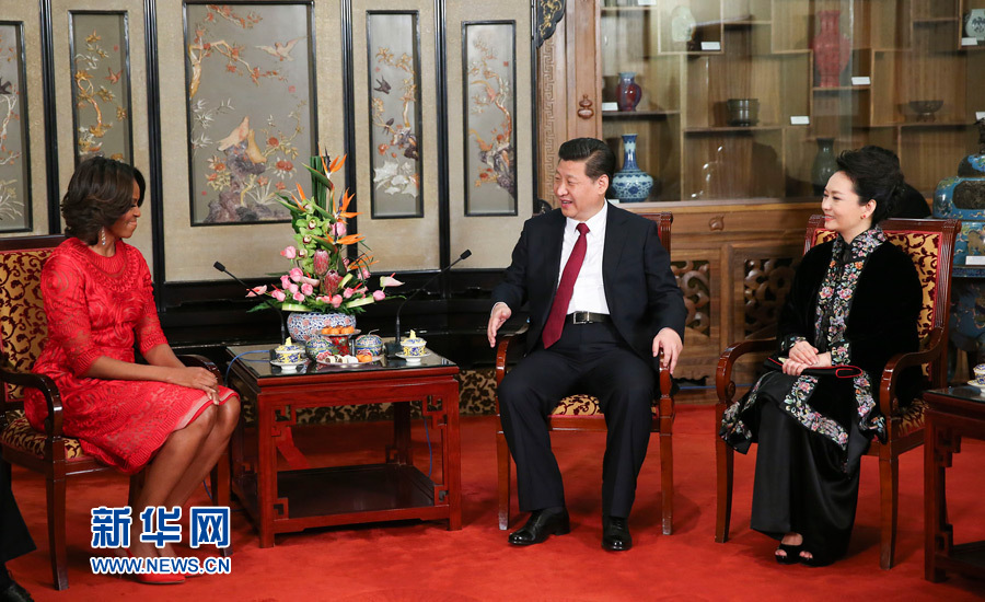 3月21日,国家主席习近平和夫人彭丽媛在北京钓鱼台国宾馆会见美国总统奥巴马夫人米歇尔。 新华社记者 兰红光 摄