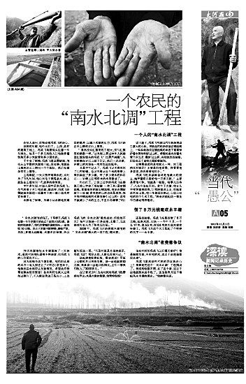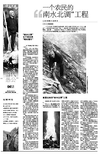 2010年10月3日,大河报独家报道了洛阳宜阳县莲庄乡沙坡头村56岁老农冯无飞一个人的“南水北调”工程。