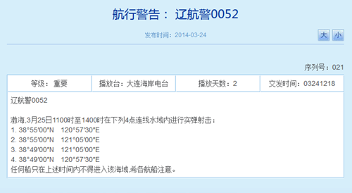 中新网3月24日电 据辽宁海事局网站消息,3月25日11时至14时,在渤海相关水域将进行实弹射击,要求期间任何船只不得进入该海域。