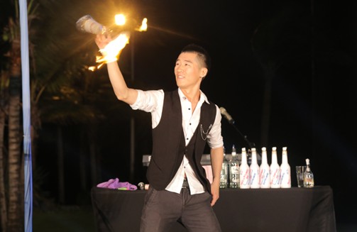 鸡尾酒会的神秘人物出现了!他就是为嘉宾们调出美味鸡尾酒的调酒师。看!他超炫的调酒特技就像信手拈来,飞快转动手中的调酒器让嘉宾们目不暇接。就像魔术一般神奇的鸡尾酒在他手里诞生,酒瓶与调酒师仿佛融为一体,表演精彩绝伦!