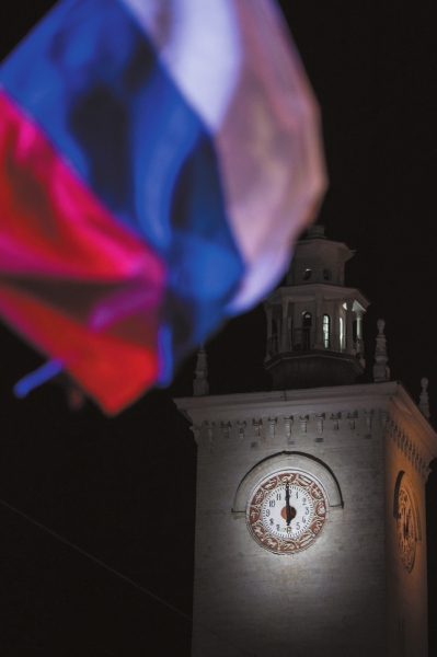 在克里米亚首府辛菲罗波尔火车站,数百人聚集在那里,挥舞俄罗斯国旗,高喊口号“克里米亚,俄罗斯”,见证火车站时钟调表的时刻。当时钟调整完毕后,在场人们唱起俄罗斯国歌。