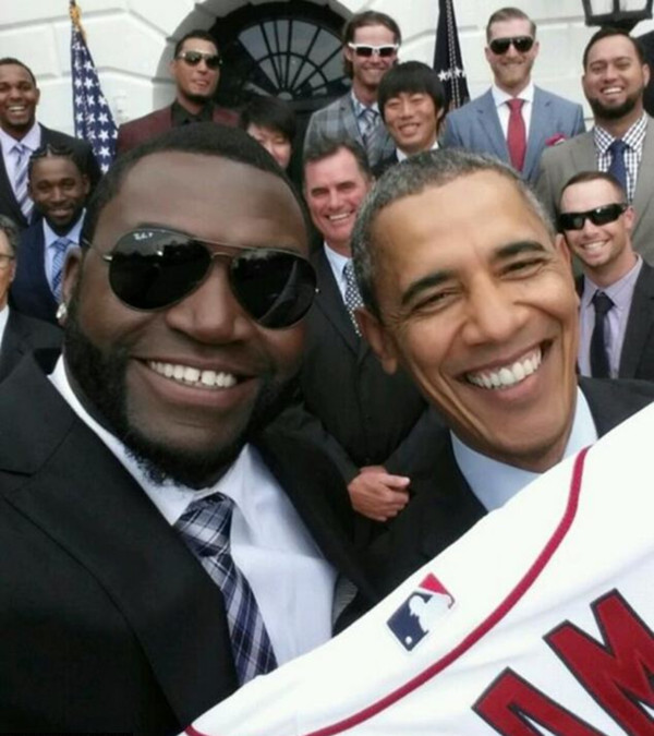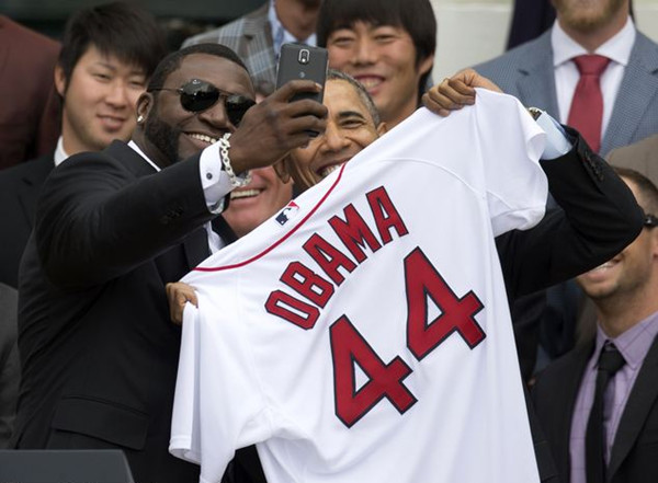 国际在线专稿:据英国《每日邮报》4月1日报道,美国总统奥巴马于当地时间4月1日欢迎世界职业棒球大赛冠军波士顿红袜队(Red Sox)做客白宫,并与明星球员大卫·欧提兹(David Ortiz)自拍合影,获赠44号球衣。