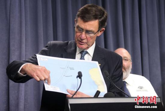 4月7日,澳大利亚搜寻马航失联客机联合协调中心首席协调员安格斯·休斯顿透露,澳大利亚海军“海洋之盾”号搜救船6日使用拖曳声波定位仪在水下两次侦测到脉冲信号,特征与飞机黑匣子信号相符,澳方船只发现信号的位置与中国“海巡01”轮此前侦测到信号的位置相距300多海里。图为安格斯·休斯顿在记者会上用地图讲解“海洋之盾”号与“海巡01轮”目前所在的位置。中新社发 张明 摄