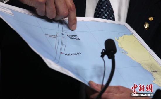 资料图:图为安格斯·休斯顿在记者会上用地图讲解“海洋之盾”号与“海巡01轮”目前所在的位置。中新社发 张明 摄