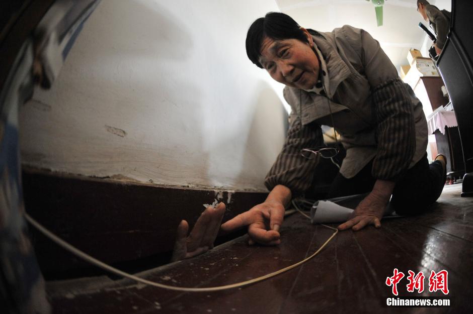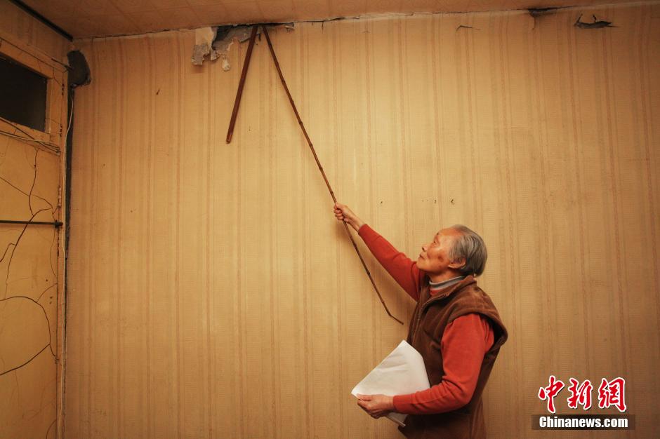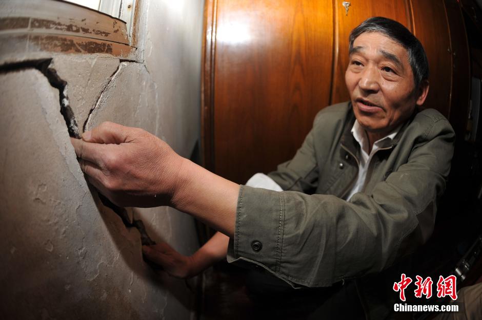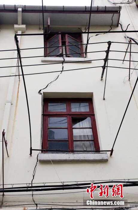 4月11日,记者在上海天山二村120号目睹,该楼房室内和外墙出现了不同程度的墙面开裂,门窗倾斜,二楼住户的手能从屋顶伸到三楼,该楼房共有14户居民目前已有7户搬离。据了解,天山二村小区建于1957年,对120号居民楼造成破坏的原因,估计是不远处一商业中心的开建。目前居民、物业、开发商仍在协商,展开维修工作。张亨伟 摄