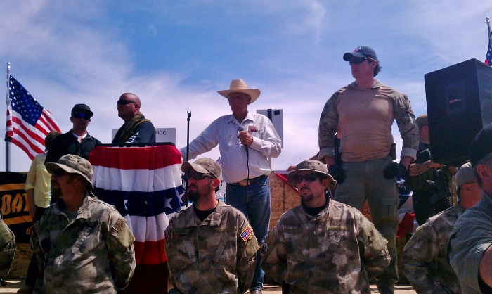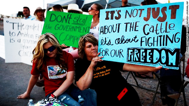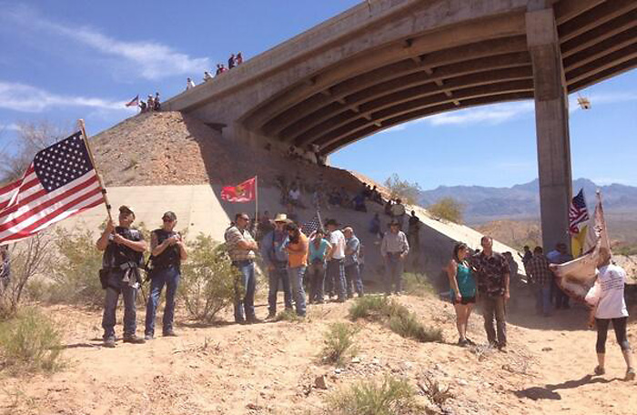 据悉,美国内华达州的一名牧场主克利文•邦迪(Cliven Bundy)自1993年起拒向联邦土地管理局缴纳管理费,并欠费逾1百万美元,遭到联邦政府“捕牛清场”。内华达州村民因联邦政府侵犯自由,自组民兵队,持枪加入牧场主与联邦政府之战。