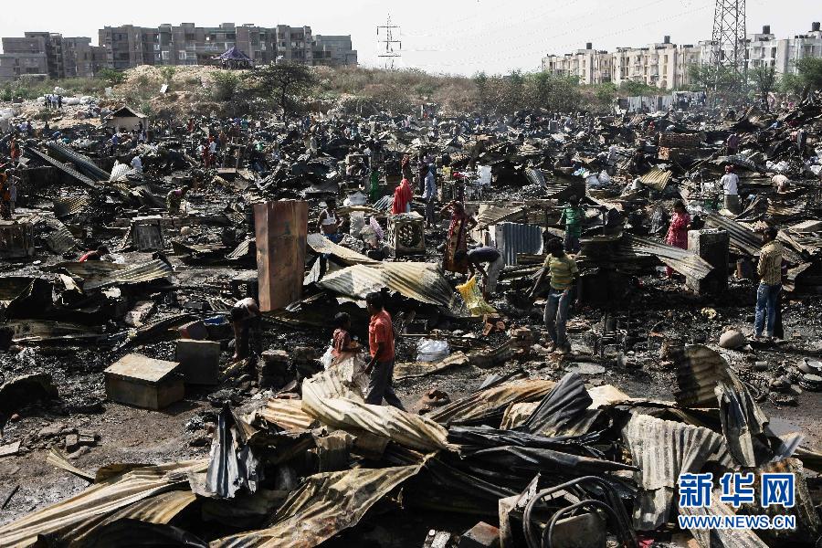 4月25日,在印度首都新德里南部的一处贫民区,人们聚集在火灾事故现场。当日,印度新德里南部一处贫民区发生火灾,造成约500所棚屋损毁,目前暂无人员伤亡的消息。 新华社记者郑焕松摄