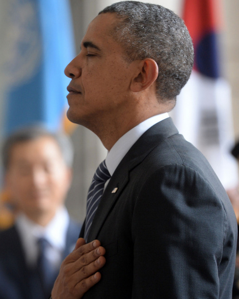 奥巴马总统在默哀时把手放在了胸前表示哀悼(网页截图)