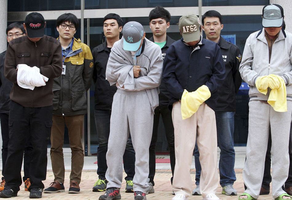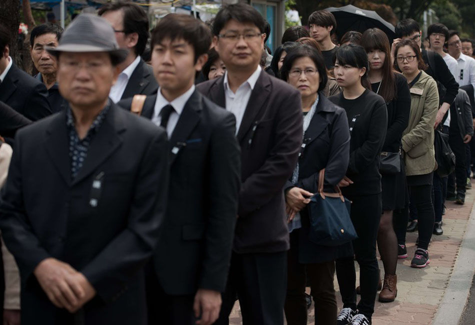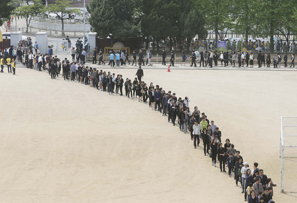 当地时间2014年4月26日,韩国安山,大批民众在操场上排成长而曲折的队列,排队等候前往安山奥林匹克室内体育馆设置的临时集体灵堂,吊唁沉船事故的遇难者。据悉,由于前来悼念的人数众多,附近的京畿道安山小学开放操场供民众排队等候。