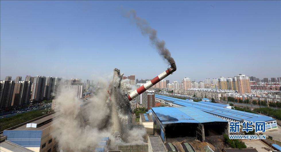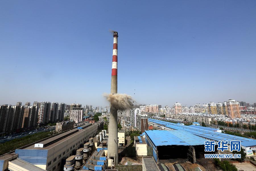 (4月28日,沈阳市内最高烟囱爆破后倒下。 新华社记者姚剑锋摄")