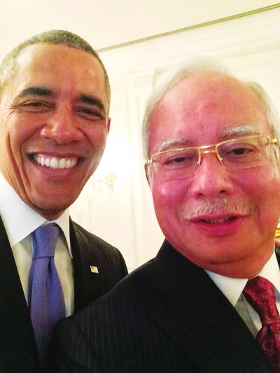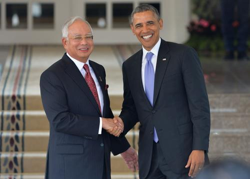 4月27日,在马来西亚普特拉贾亚总理官邸,美国总统奥巴马(右)与马来西亚总理纳吉布握手。 奥巴马26日起对马来西亚进行为期3天的国事访问。新华社发