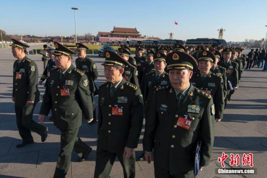 3月13日上午,第十二届全国人民代表大会第二次会议在人民大会堂举行闭幕会。解放军代表列队步入会场。中新社发 骆云飞 摄