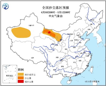 受东移较强冷空气影响,预计4月30日08时至5月1日08时,南疆盆地、内蒙古西部、甘肃中西部、宁夏北部等地有扬沙或浮尘,其中,内蒙古西部、甘肃西北部等地的部分地区有沙尘暴,局地有强沙尘暴。