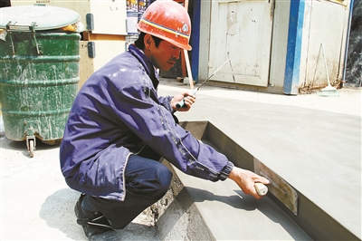 4月29日上午11点,戴着红色安全帽,身穿灰蓝色工服的曹昌宝如约出现在朝阳区一个商务楼工地门口。见到北青报记者,他首先递过来一顶安全帽说:“进工地都得戴。”北青报记者看到,曹昌宝另一只手还拎着沾满泥浆的瓦工刀和抹子。