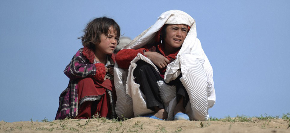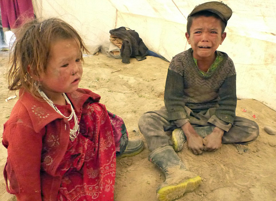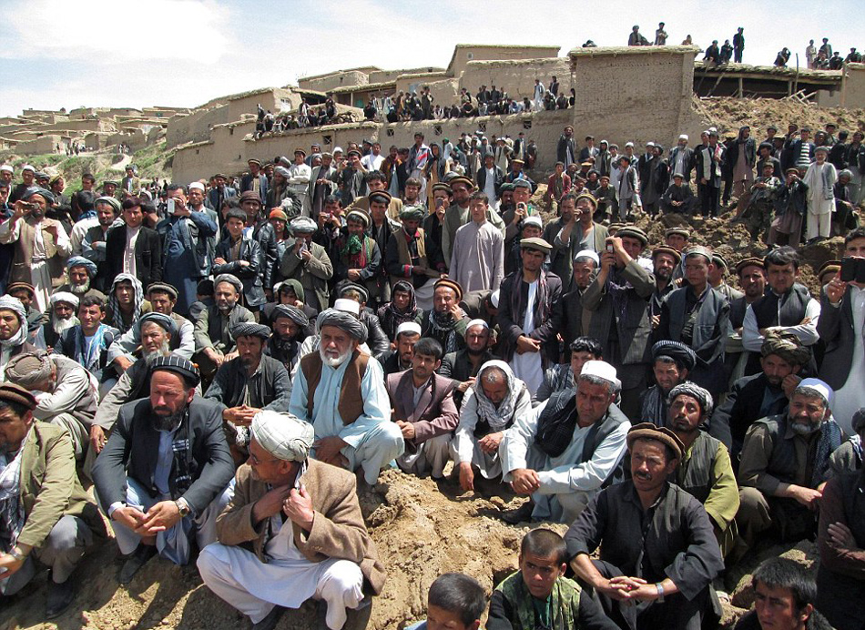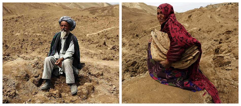 一名阿富汗男子呆坐在发生滑坡的土地上。右边的女子在这场灾难中失去了她的家人与数百名同乡。