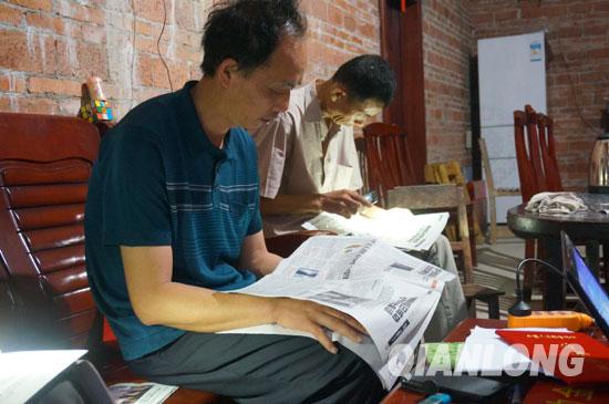 小叶的父亲(前)在仔细阅读媒体上关于儿子捐赠器官的报道。广西新闻网供图