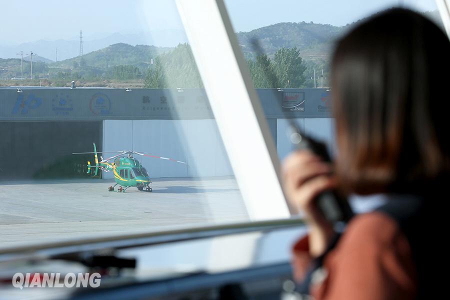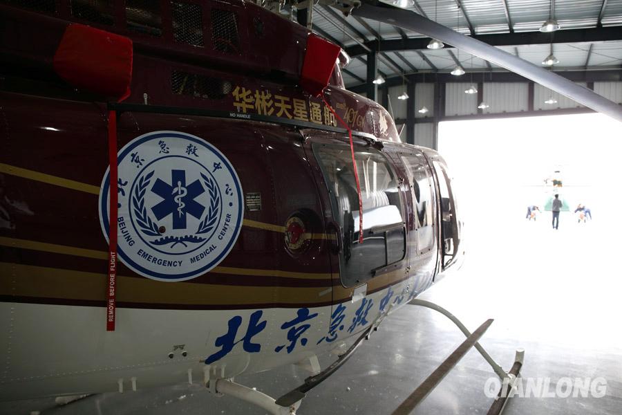 120北京急救中心24小时直升机。当日,这架直升机正在做维护,曹威紧急调动了另一架bell-429型直升机执行任务。千龙网实习记者 王悦摄