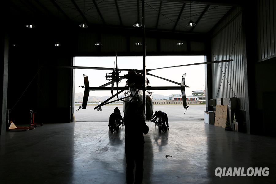当日执行任务的bell-429型直升机已经入库,“它和它的同伴们”在这里静静的等待下一次的飞行。千龙网实习记者 王悦摄