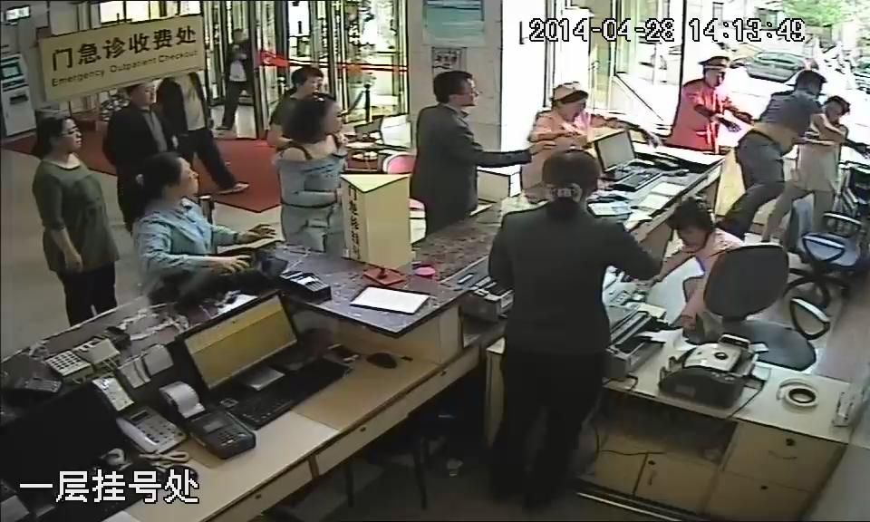 4月28日14时13分,山西博爱医院大厅内,一名男子冲进医护人员工作区,用手中的文件袋朝护士脸上扇去,护士起身反抗,两人开始扭打。就在护士蹲下身时,该男子又对护士连踢两脚,随后在众人帮助下王某离开工作区。