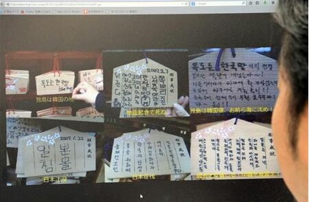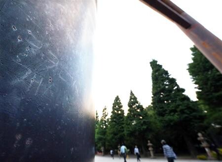 图为靖国神社大鸟居立柱上的“狗畜生”韩文字涂鸦