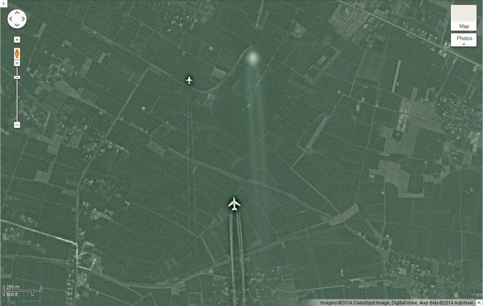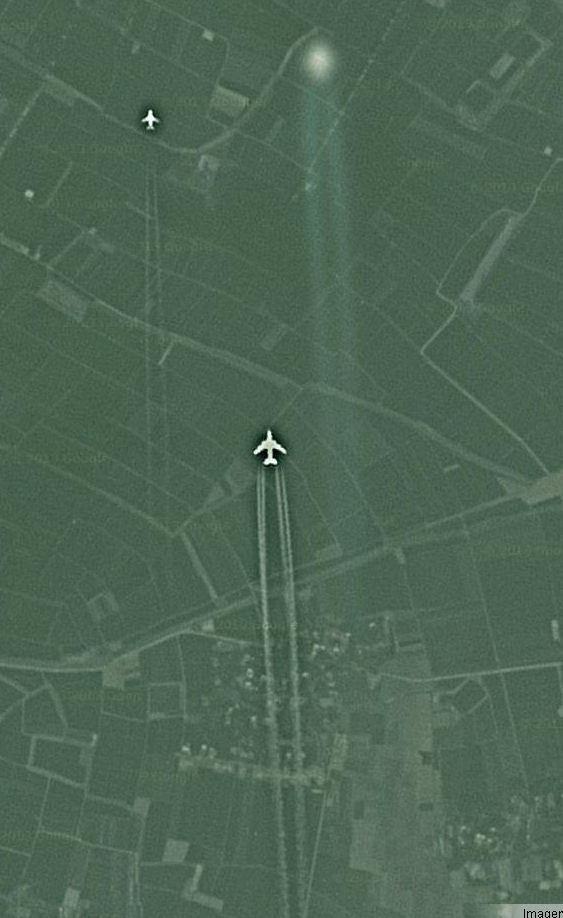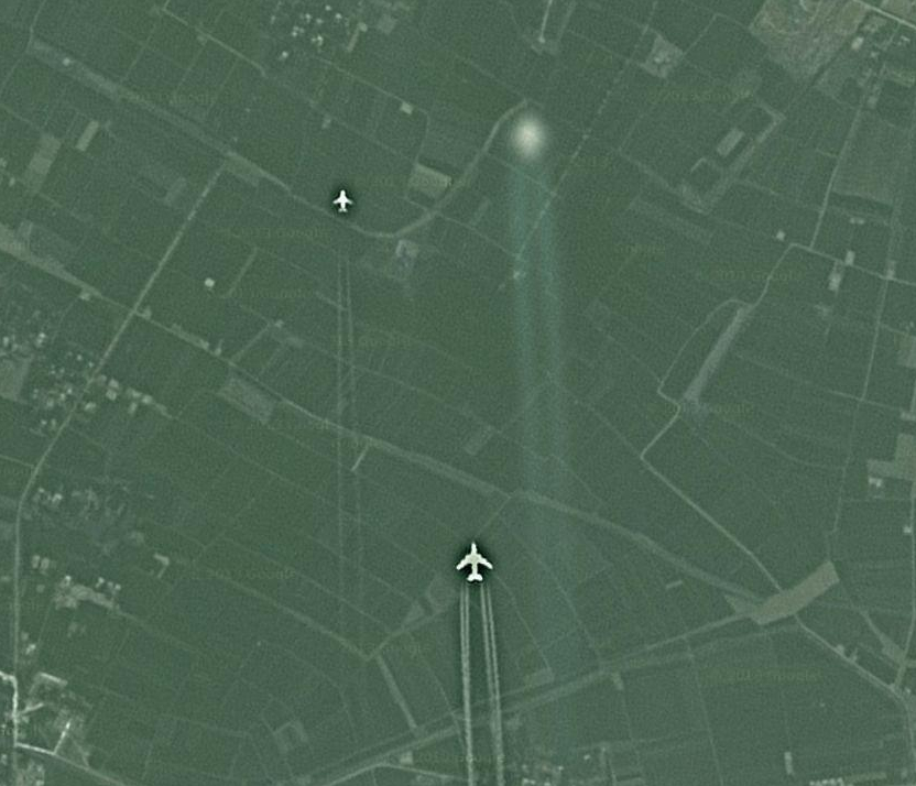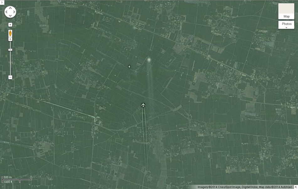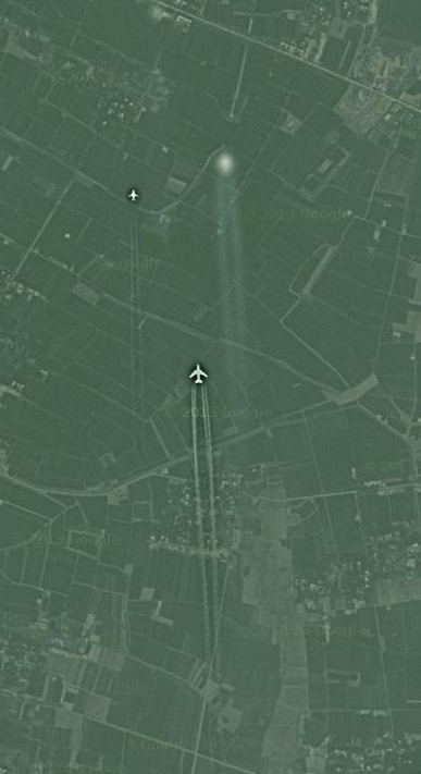 谷歌卫星疑现中国战机追逐UFO【环球军事报道】近日,来自GOOGLE地球的一张卫星图片在网络上引起不小关注。在这张“河南省驻马店市正阳县东金庄”地区的卫星地图上,出现了两架飞行中飞机,而飞机前方的是一个圆形不明飞行物,三者都拖着长长的尾迹,形成了一副追逐的画面,不少人都认为这是中国战机正在跟踪、追赶UFO的现场。