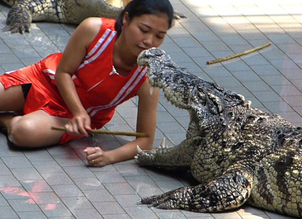 2013年,泰国曼谷旁的鳄鱼农场就发生了鳄鱼咬驯兽员事故,所幸驯兽员躲避及时,鳄鱼在闭嘴的时候牙齿划到了驯兽员的头顶。该驯兽员从耳朵到头颅被缝了30针,但没有生命危险。