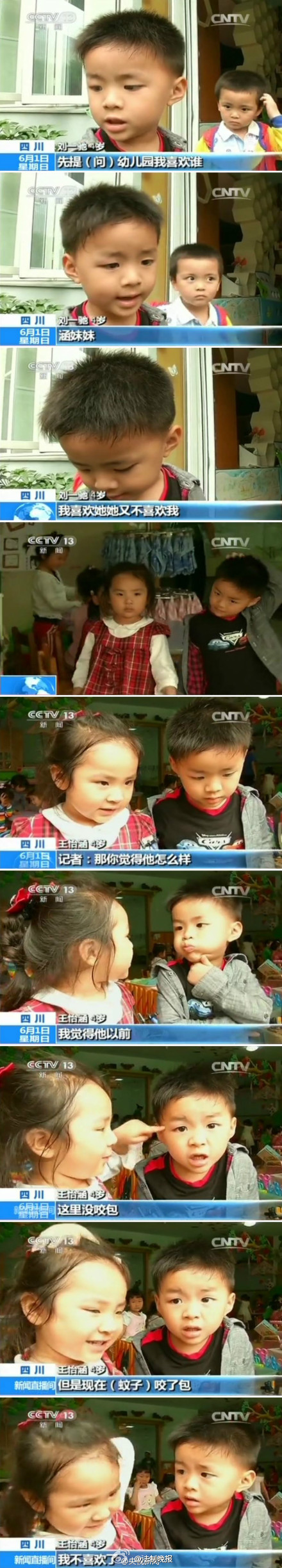 时刻新闻 —分享— 截图 儿童节,央视播出特别节目《童言无忌》,一名4岁的小男孩主动要求记者问自己在幼儿园喜欢谁,结果小男孩叫来了喜欢的小女孩,人家却说:“他现在被蚊子咬了包,我不喜欢了…” 来源:央视 编辑:蔡娟 实习生 申太阳